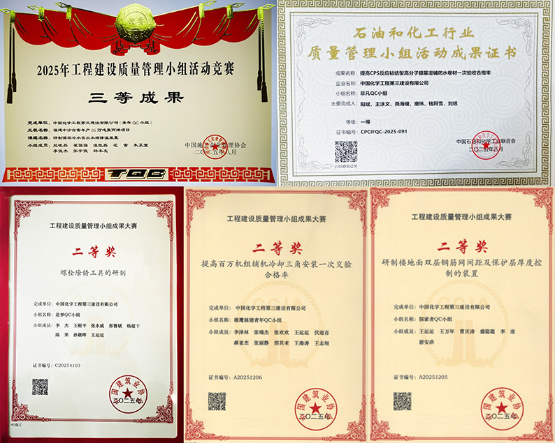 近日,在中国石油化工联合会主办的2025年第四十四次石油和化工行业质量管理小组活动成果大赛中,中国化学工程第三建设有限公司北京分公司“非凡QC小组”发布的《提高CPS反应粘结型高分子膜基湿铺防水卷材一次验收合格率》QC成果荣获一等奖。 2025年,公司在全面质量管理小组活动中成果丰硕,共有4项成果经行业协会推荐参加国家级比赛,获评二等奖3项、三等奖1项。江苏分公司“追梦QC小组”的《螺栓除锈工具的研制》、第二建安工程公司“雄鹰展翅青年QC小组”的《提高百万机组辅机冷却三角安装一次交验合格率》、建筑工程二公司“探索者QC小组”的《研制楼地面双层钢筋网间距及保护层厚度控制的方法》均获中国建筑业协会二等奖;建筑工程三公司“青年QC小组”的《研制循环冷水管出水端降温装置》获中国施工企业管理协会三等奖。 各QC小组围绕工程实际问题展开技术攻关,成效显著: 北京分公司“非凡QC小组”针对CPS防水卷材一次验收合格率由88.5%提升至97%,超出业主95%的要求,并形成《CPS防水卷材施工方法作业指导书》,为后续项目提供重要参考。 江苏分公司“追梦QC小组”在成本受限情况下,创新研制螺栓除锈工具,积极降本增效,有效应对台风后螺栓锈蚀问题。 第二建安工程公司“雄鹰展翅青年QC小组”通过系统优化安装工艺,将辅机冷却三角一次验收合格率从84%提升至96%,有效实现成本管控,赢得业主与监理单位好评。 建筑工程二公司“探索者QC小组”研发钢筋间距与保护层控制新方法,使验收合格率由65%提升至96%,有效节约返修成本,助力项目高效推进。